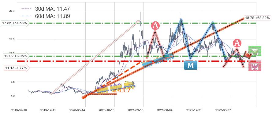 ♘ 阻力价格位12.02,可信任强度67.73%,距离最后交易2022-08-12形成的收盘价格11.33相差 +6.05%