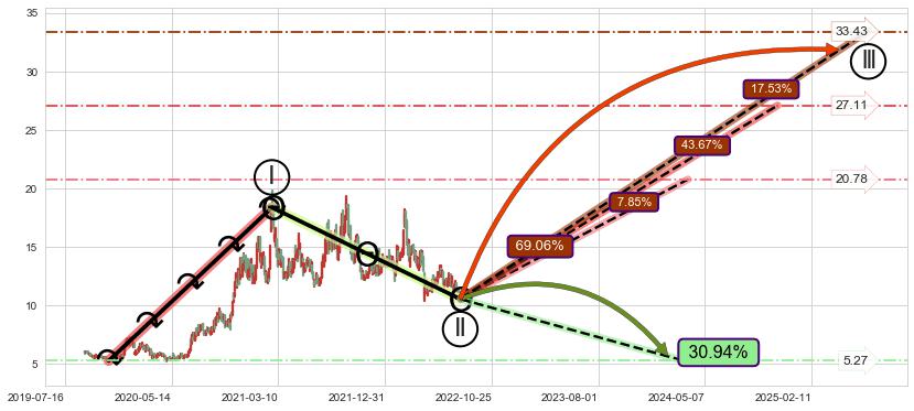 ♘ 阻力价格位17.85,可信任强度63.00%,距离最后交易2022-08-12形成的收盘价格11.33相差 +57.53%