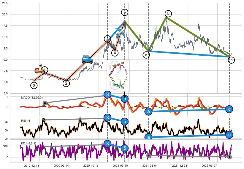 ➣ 1,3,5驱动浪MACD, RSI, KDJ走势都出现【常规背离】反转信号增强