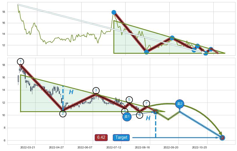 ➣ 【未确认突破,预测即将形成突破】下降三角形整理起点:2022-03-02, 预测突破点:2022-08-23,形态共119交易日