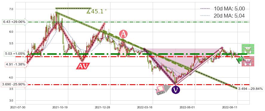 ♘ 阻力价格位5.03,可信任强度86.59%,距离最后交易2022-08-12形成的收盘价格4.98相差 +1.05%