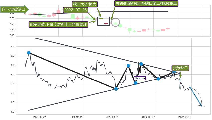 ➣ 【多空双方观望→争持→促使价格波动日益狭窄→空方打破攻守平衡点】对称三角形中继整理, 已在2022-07-14突破【支撑】颈线 7.98 →演变成下降通道