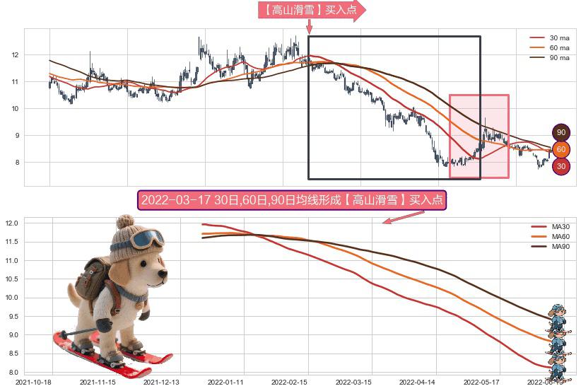 ⚀ 2021-12-22日-2022-06-09日显现 30日-60日-90日均线 【高山滑雪】买入点 看多信号,后市看涨,买入