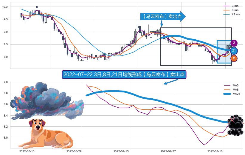 ⚀ 2022-06-30日-2022-08-12日显现 3日-8日-21日均线 【乌云密布】卖出点 看空信号,后市看跌,卖出