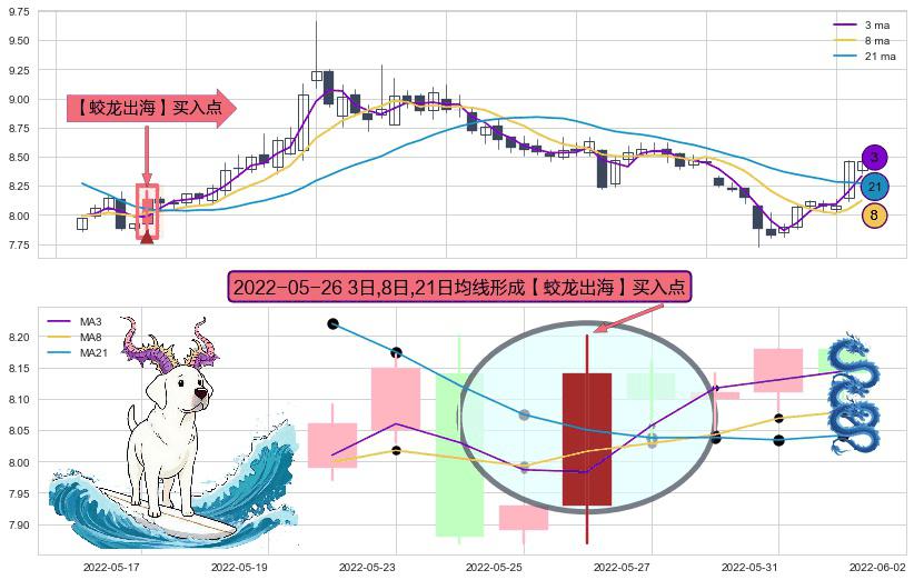 ⚀ 2022-05-26日显现 3日-8日-21日均线 【蛟龙出海】买入点 看多信号,后市看涨,买入