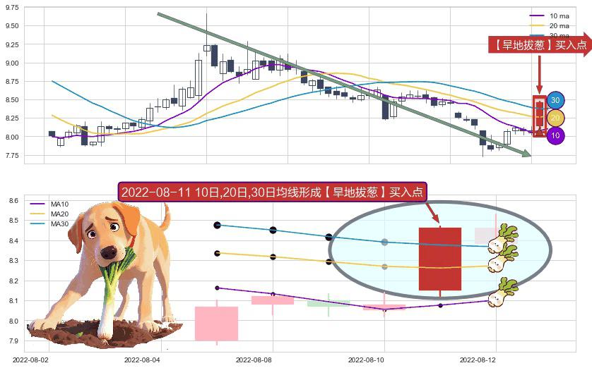 ⚀ 2022-08-11日显现 10日-20日-30日均线 【旱地拔葱】买入点 看多信号,后市看涨,买入