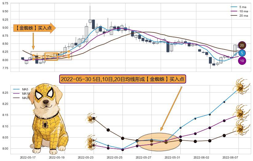 ⚀ 2022-05-30日显现 5日-10日-20日均线 【金蜘蛛】买入点 看多信号,后市看涨,买入