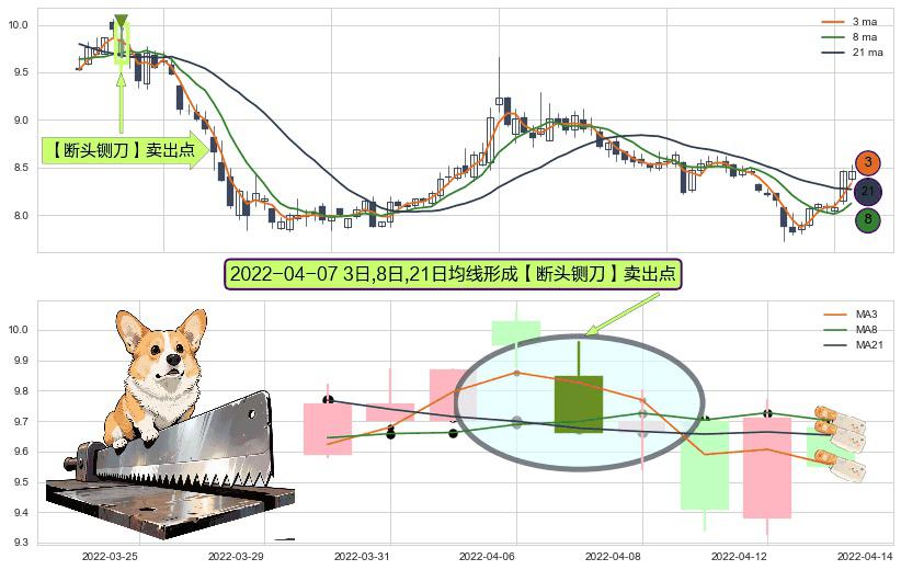 ⚀ 2022-04-07日显现 3日-8日-21日均线 【断头铡刀】卖出点 看空信号,后市看跌,卖出