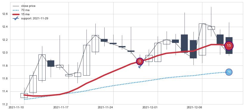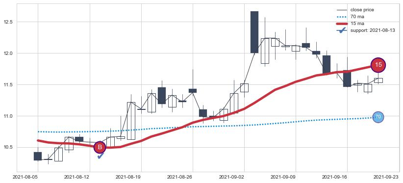 ⚁ MA3和MA8走势平行,且始终保持在短距离内,MA21始终在短中期均线上方,与短中期均线保持一定的距离,微微下行