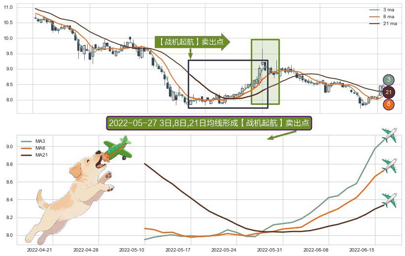 ⚀ 2022-05-10日-2022-06-16日显现 3日-8日-21日均线 【战机起航】卖出点 看空信号,后市看跌,卖出