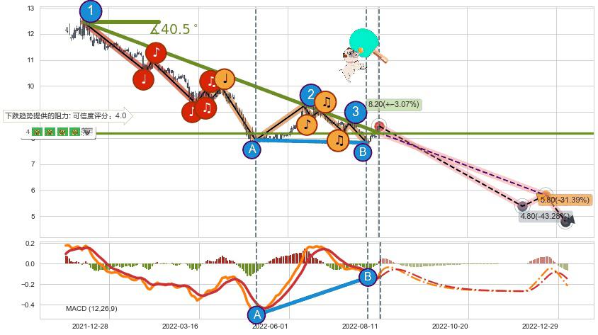 ♘ 在最后的下跌阶段2021-12-08至2022-08-11,存在 破位边缘的阻力位 ,阻力价格8.20,可信任强度85.12%,其距离最后价格8.46相差 -3.07%