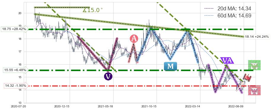 ♘ 支撑价格位14.32,可信任强度63.48%,距离最后交易2022-08-12形成的收盘价格14.60相差 -1.90%