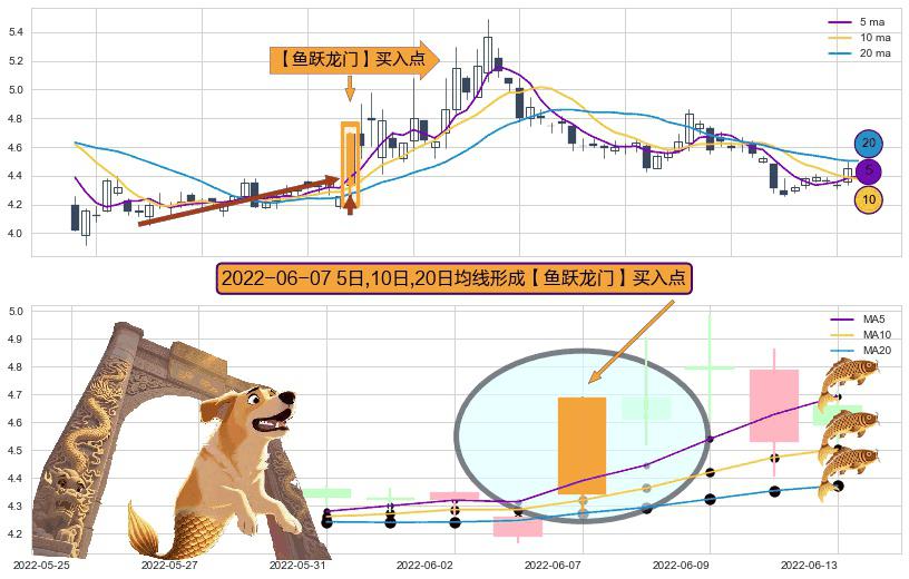 ⚀ 2022-06-07日显现 5日-10日-20日均线 【鱼跃龙门】买入点 看多信号,后市看涨,买入