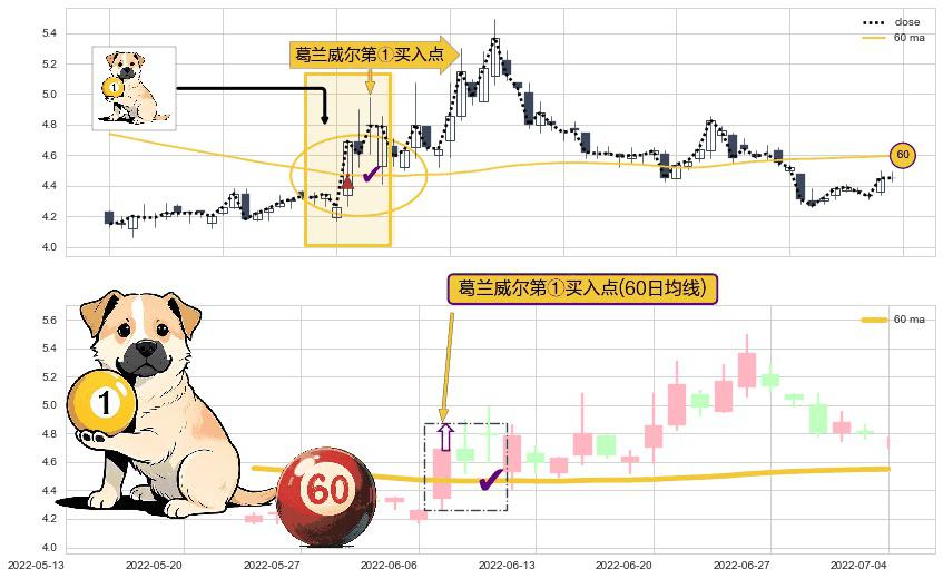 ⚀ 2022-06-07-日显现 葛兰威尔均线 60日均线 第买①入点 走势反转见底信号,后市看涨,买进信号