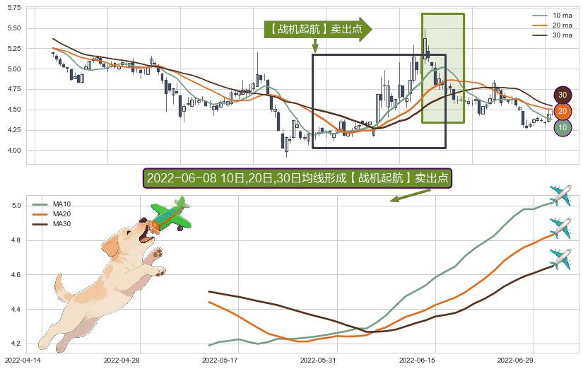 ⚀ 2022-05-12日-2022-07-01日显现 10日-20日-30日均线 【战机起航】卖出点 看空信号,后市看跌,卖出