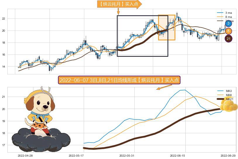⚀ 2022-05-17日-2022-06-27日显现 3日-8日-21日均线 【烘云托月】买入点 看多信号,后市看涨,买入
