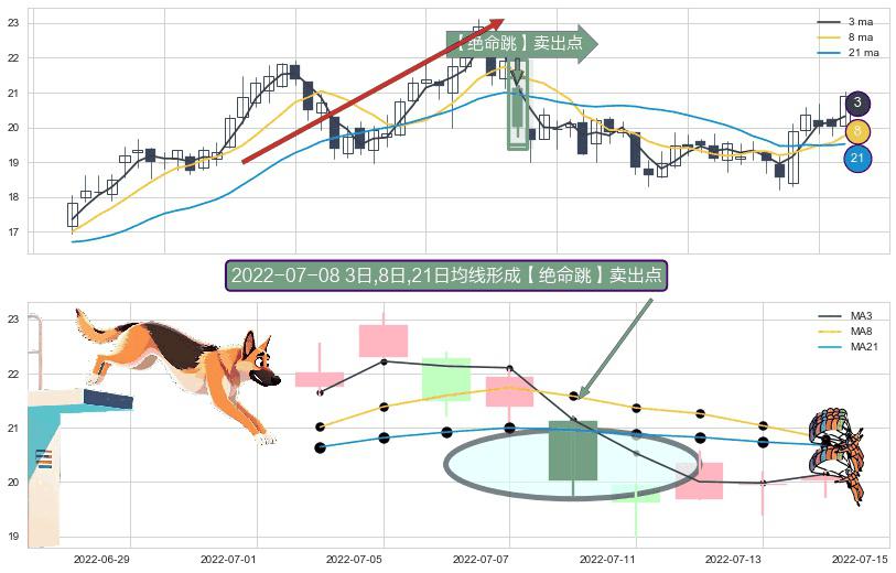 ⚀ 2022-07-08日显现 3日-8日-21日均线 【绝命跳】卖出点 看空信号,后市看跌,卖出