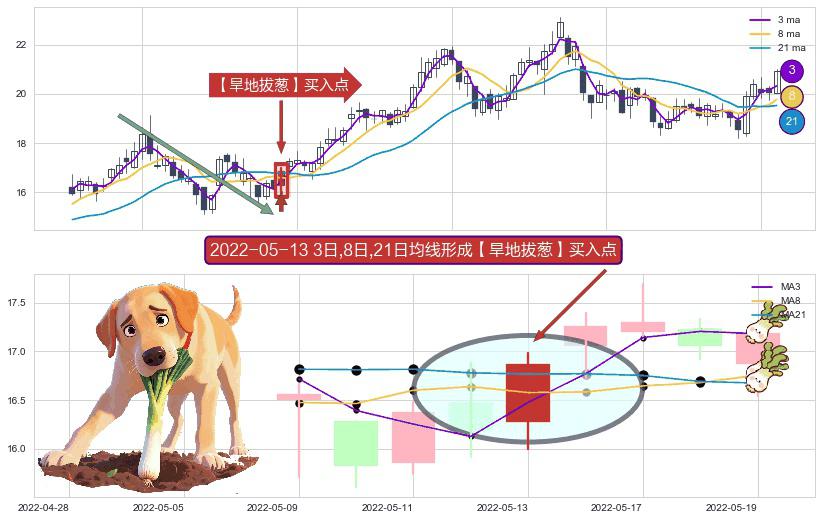 ⚀ 2022-05-13日显现 3日-8日-21日均线 【旱地拔葱】买入点 看多信号,后市看涨,买入