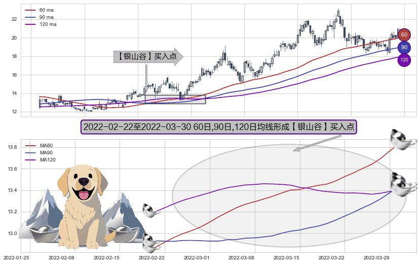 ⚀ 2022-02-23-日至2022-03-30-日显现 60日-90日-120日均线 【银山谷】买入点 看多信号,后市看涨,买入