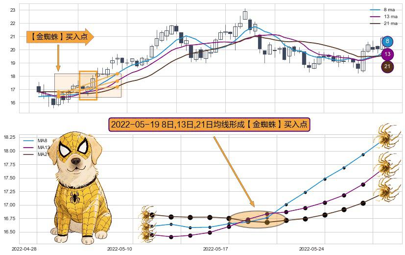 ⚀ 2022-05-19日显现 8日-13日-21日均线 【金蜘蛛】买入点 看多信号,后市看涨,买入