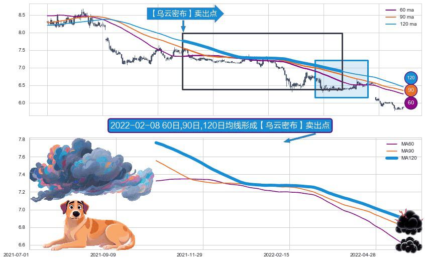 形态多维评估: ⚀ 2021-10-21日-2022-05-25日显现 60日-90日-120日均线 【乌云密布】卖出点 看空信号,后市看跌,卖出