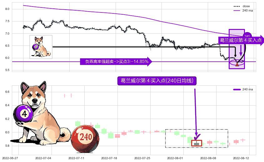 形态多维评估: ⚀ 2022-08-03-日显现 葛兰威尔均线 240日均线 第④买入点 下降趋势均值回复的短线反弹信号,后市看涨,买进信号