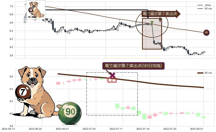 形态多维评估: ⚀ 2022-07-07-日显现 葛兰威尔均线 90日均线 第⑦卖出点 下降趋势的中继信号,后市看跌,卖出信号