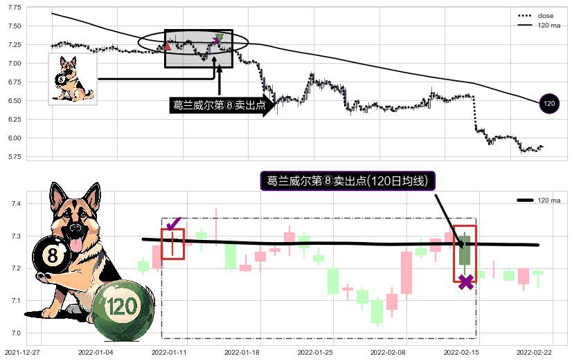 形态多维评估: ⚀ 2022-02-14-日显现 葛兰威尔均线 120日均线 第⑧卖出点 下降趋势的中继信号,后市看跌,卖出信号