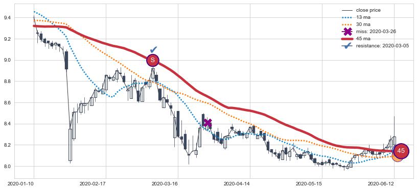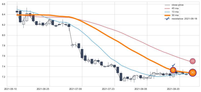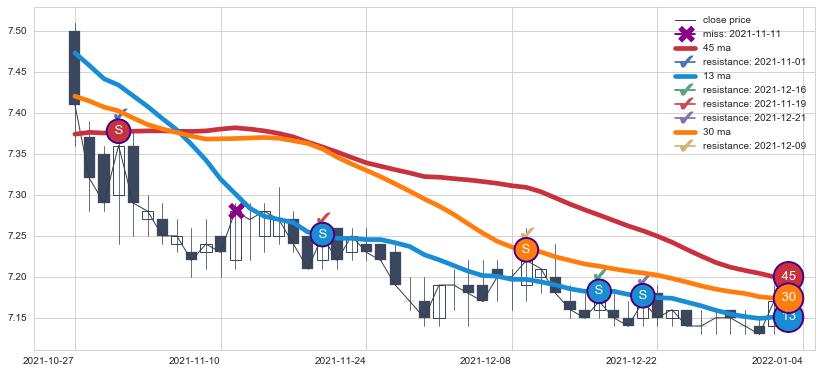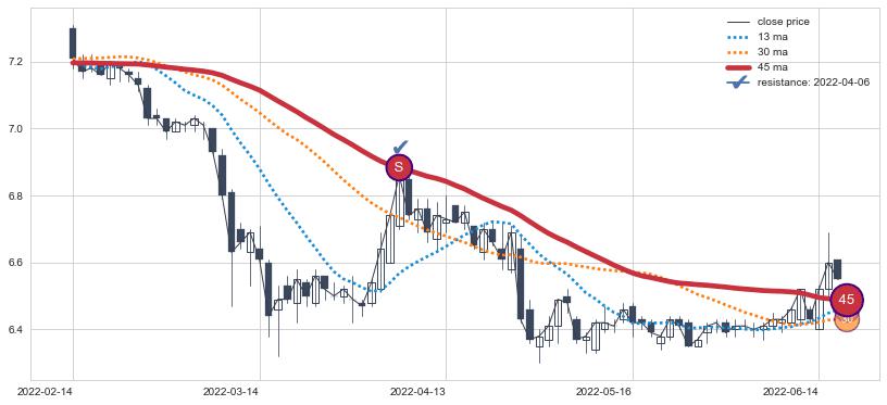 下跌趋势2021-10-27-2022-01-04,均线13, 45, 30确认关键阻力5处