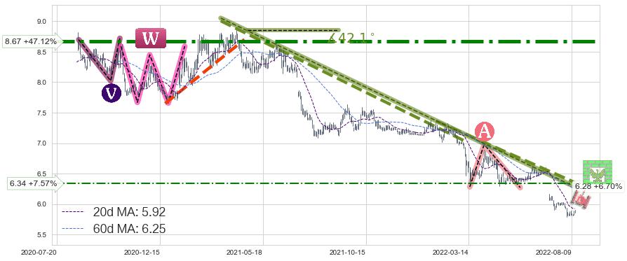 ♘ 阻力价格位8.67,可信任强度98.11%,距离最后交易2022-08-12形成的收盘价格5.89相差 +47.12%