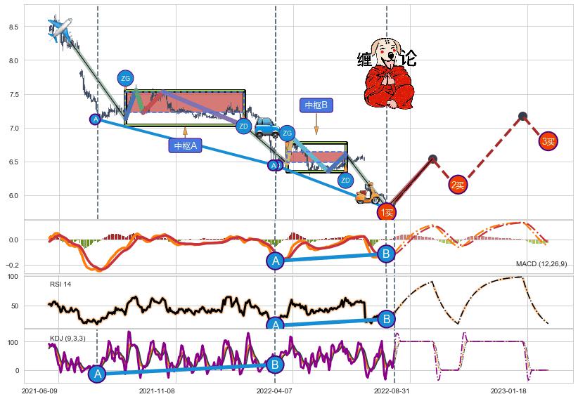 ➢ 【中枢A】:2021-08-30-2022-01-28,中枢由5笔构成,共102交易日, ZG=7.53, ZD=7.22