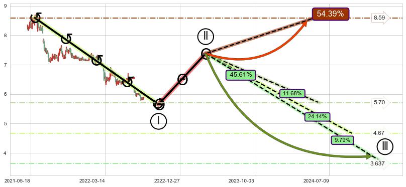 ➢ 5.1: 预测当前第5浪位置(2022-08-03, 5.81),仍然有下跌空间
