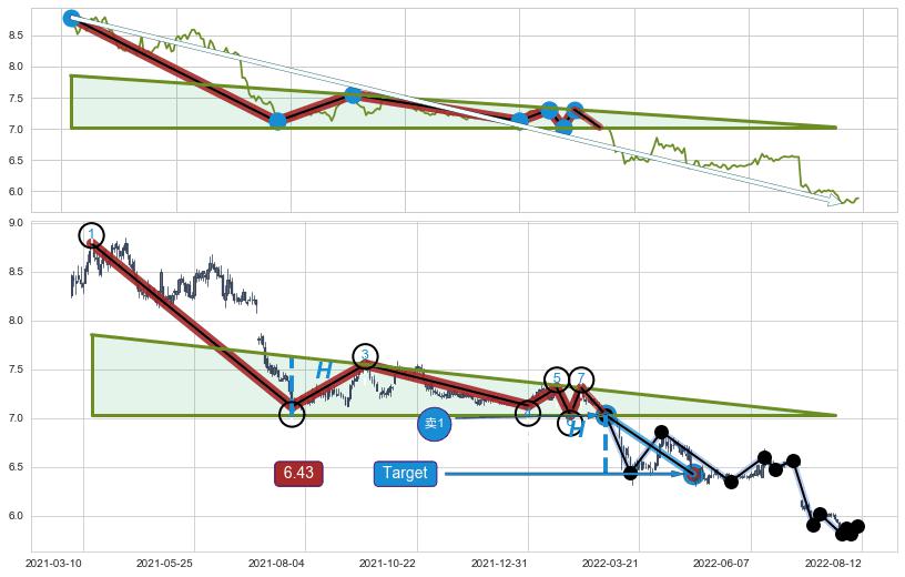 ➢ 【多方力量耗尽,空方打破攻守平衡点】下降三角形中继整理, 已在2022-02-28突破【支撑】颈线 7.03 →演变成下降通道