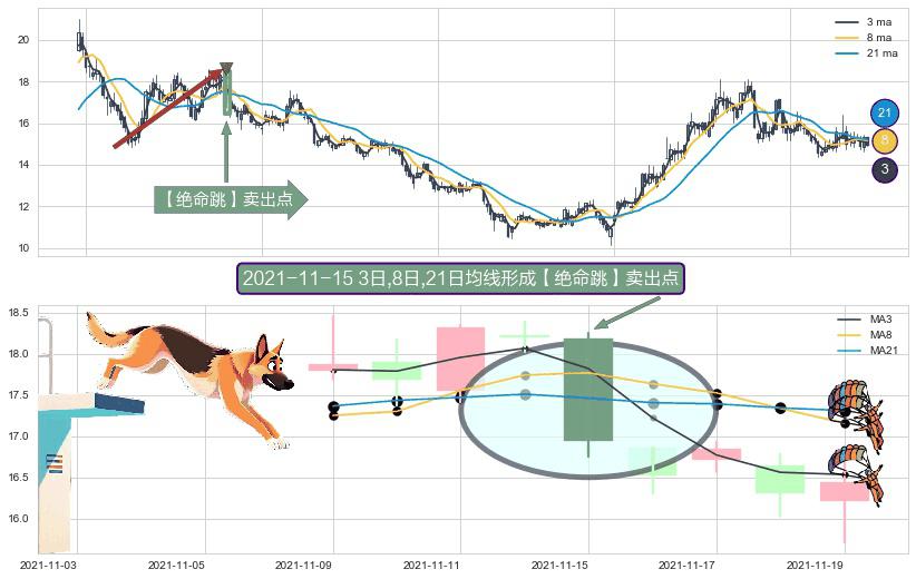 形态多维评估: ⚀ 2021-11-15日显现 3日-8日-21日均线 【绝命跳】卖出点 看空信号,后市看跌,卖出
