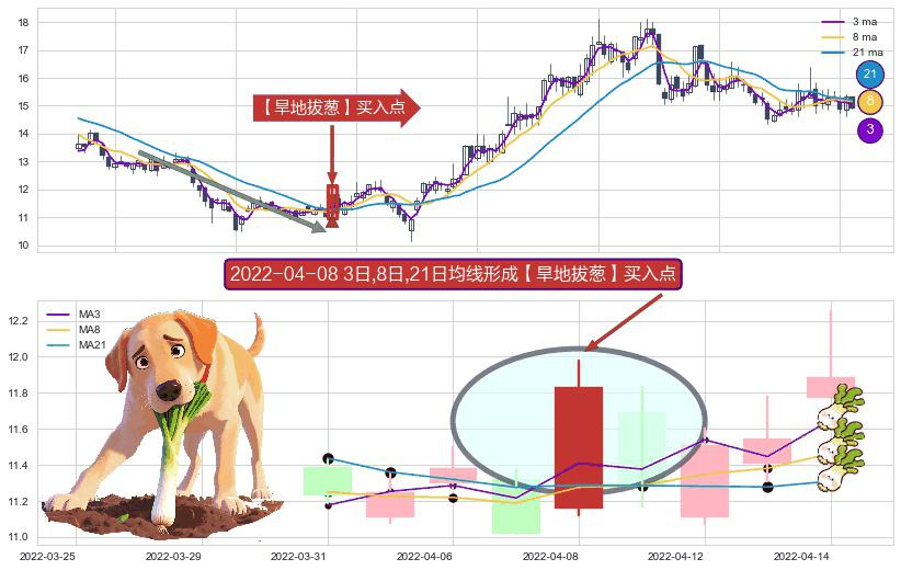 形态多维评估: ⚀ 2022-04-08日显现 3日-8日-21日均线 【旱地拔葱】买入点 看多信号,后市看涨,买入