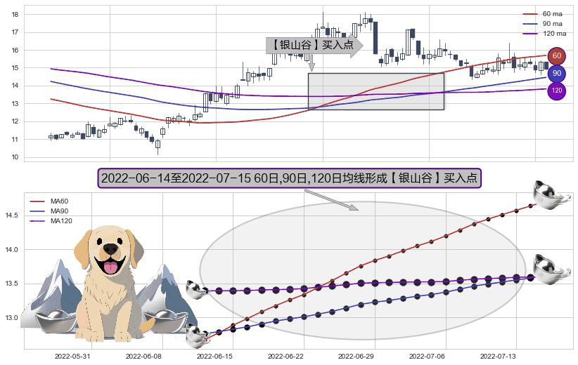 形态多维评估: ⚀ 2022-06-15-日至2022-07-15-日显现 60日-90日-120日均线 【银山谷】买入点 看多信号,后市看涨,买入