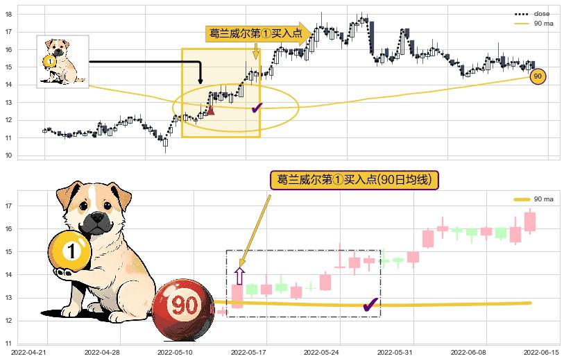 形态多维评估: ⚀ 2022-05-13-日显现 葛兰威尔均线 90日均线 第买①入点 走势反转见底信号,后市看涨,买进信号