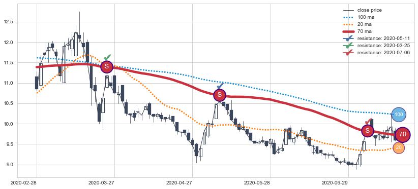 下跌趋势2020-02-28-2020-07-15,均线70确认关键阻力3处