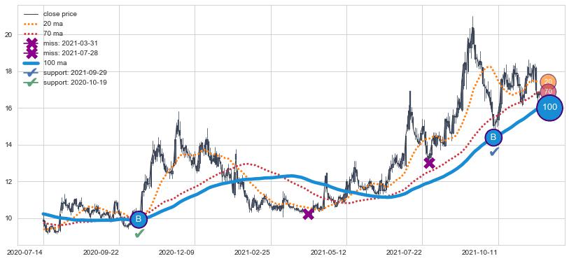 上涨趋势2020-07-14-2021-11-17,均线100确认关键支撑2处