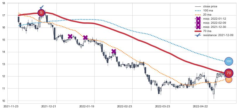 下跌趋势2021-11-23-2022-05-10,均线70确认关键阻力1处