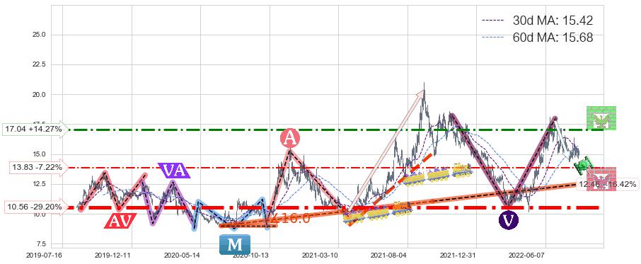 ♘ 阻力价格位17.04,可信任强度57.67%,距离最后交易2022-08-12形成的收盘价格14.91相差 +14.27%