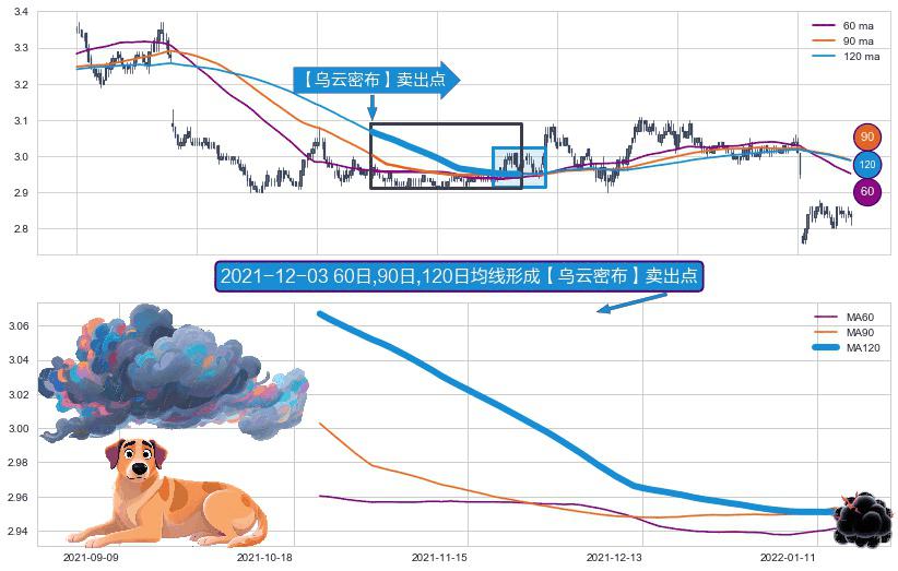 形态多维评估: ⚀ 2021-10-21日-2022-01-17日显现 60日-90日-120日均线 【乌云密布】卖出点 看空信号,后市看跌,卖出