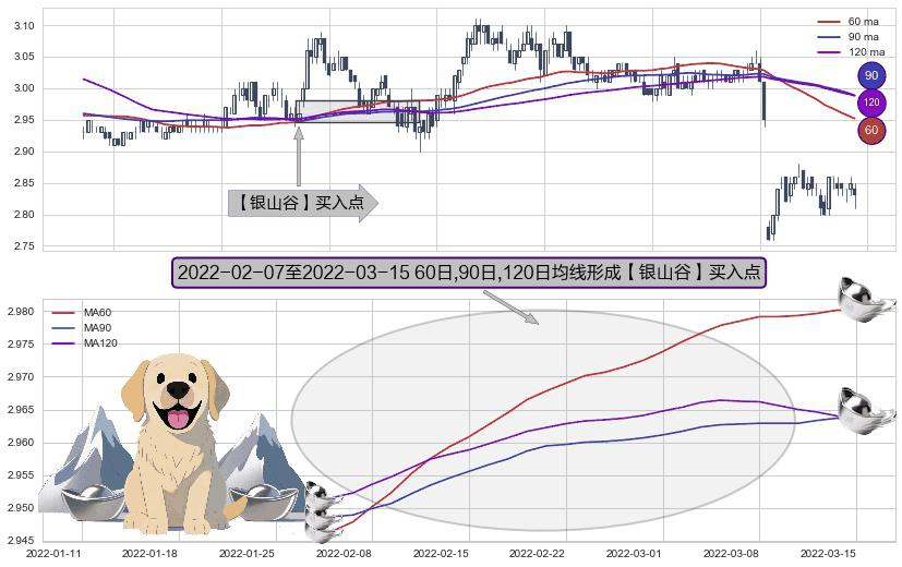 形态多维评估: ⚀ 2022-02-08-日至2022-03-15-日显现 60日-90日-120日均线 【银山谷】买入点 看多信号,后市看涨,买入