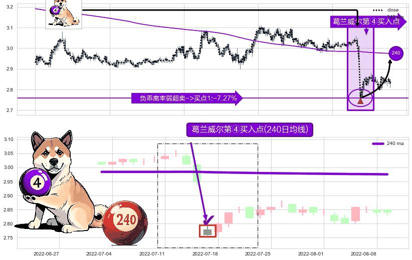形态多维评估: ⚀ 2022-07-15-日显现 葛兰威尔均线 240日均线 第④买入点 下降趋势均值回复的短线反弹信号,后市看涨,买进信号
