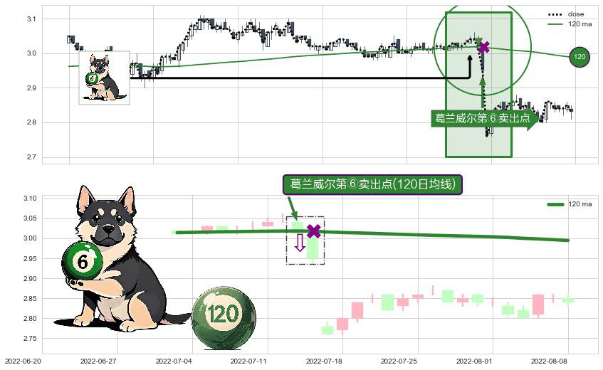 形态多维评估: ⚀ 2022-07-13-日显现 葛兰威尔均线 120日均线 第⑥卖出点 走势反转见顶信号,后市看跌,卖出信号