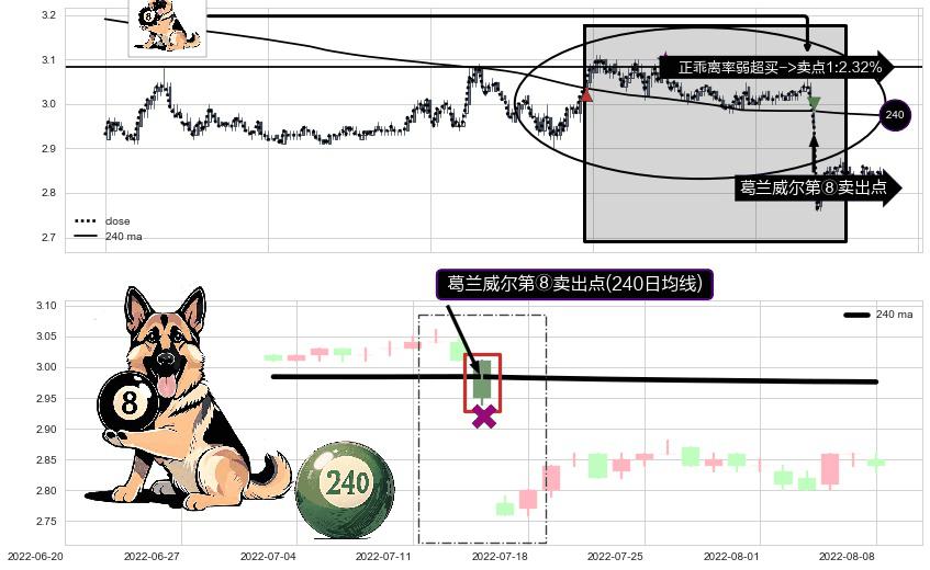 形态多维评估: ⚀ 2022-07-14-日显现 葛兰威尔均线 240日均线 第⑧卖出点 下降趋势的中继信号,后市看跌,卖出信号