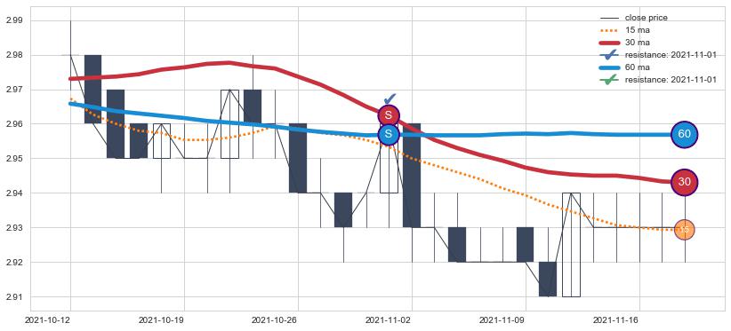 下跌趋势2021-10-12-2021-11-18,均线60, 30确认关键阻力1处