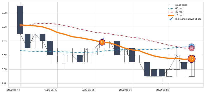 下跌趋势2022-05-11-2022-06-14,均线15确认关键阻力1处