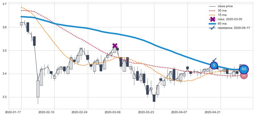 下跌趋势2020-01-17-2020-04-29,均线60确认关键阻力1处