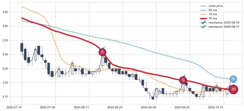 下跌趋势2020-07-14-2020-10-16,均线30确认关键阻力2处